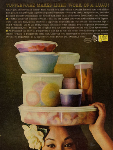 Sold at parties, mostly for and by women. Designed to save time and to extend the shelf life of food, but also a historically important opportunity for women to get out of the home, share time with each other, and achieve financial independence. At the heart of the project are the little plastic gems. Plastic and mass-produced, yes, but carefully designed with precious specificity. This one will save your carrot sticks, this one your watermelon. Lunchboxes, picnic and camping sets, popsicle molds, butter dishes–all with a boob-shaped button to be firmly pressed, no, burped. Like a baby.