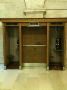 Public telephone booths in the Ghostbusters library at 42nd St. Gorgeous, vacant remnants of a time before the easy cruelty of text messaging. i’m sure there were just as many other ways for empty language to be tossed around back when these things were still necessary, but it’s comforting to imagine otherwise. If you had to stand in line, jangling sweaty quarters while you polished your proposals and refusals, if capriciousness was just harder, by default you would keep more for yourself?